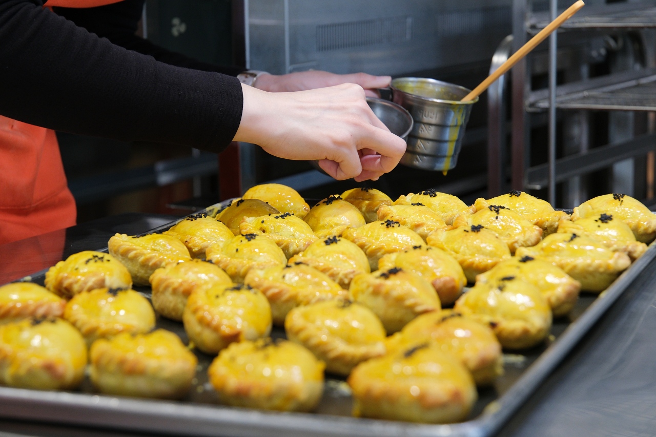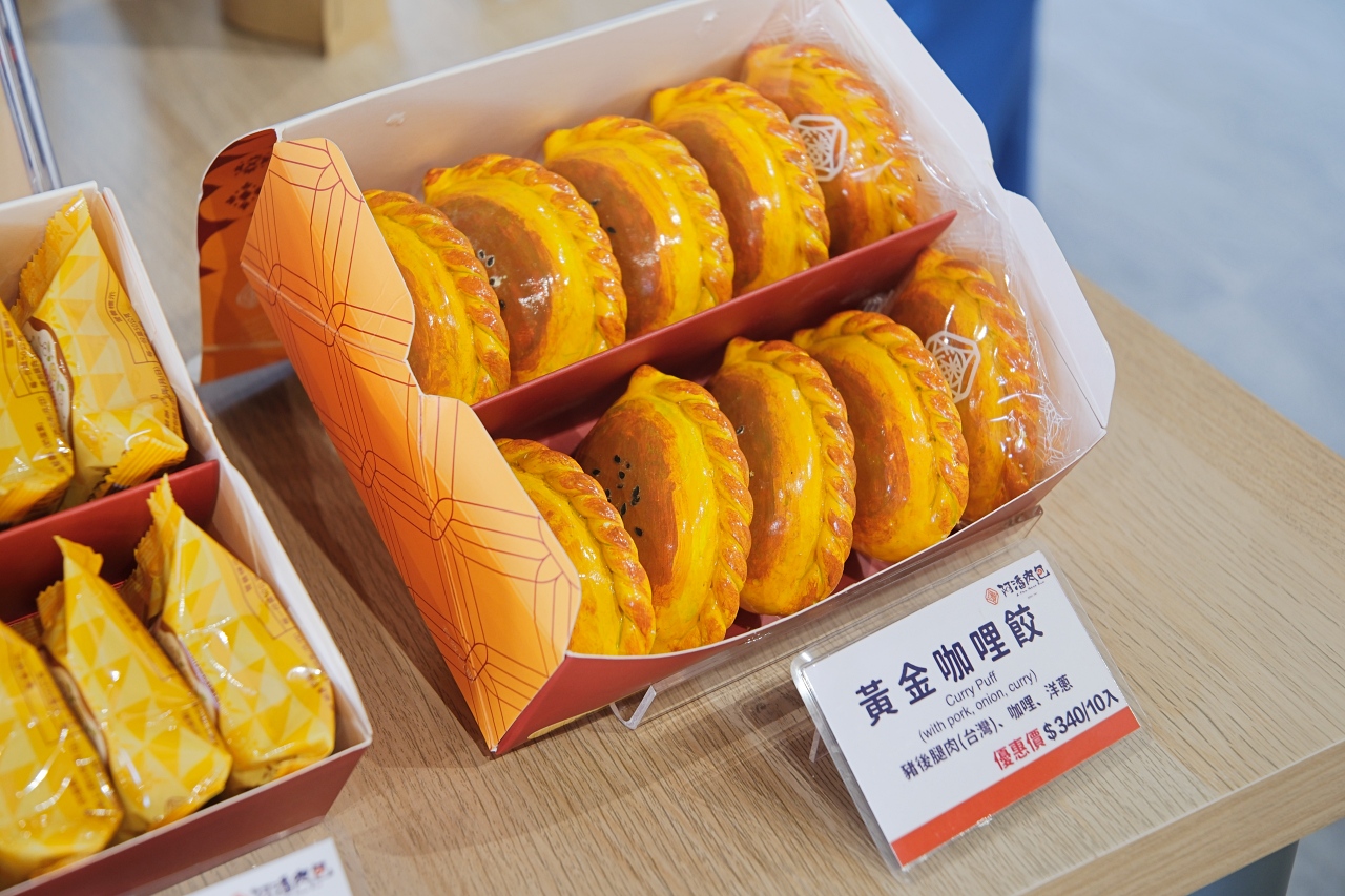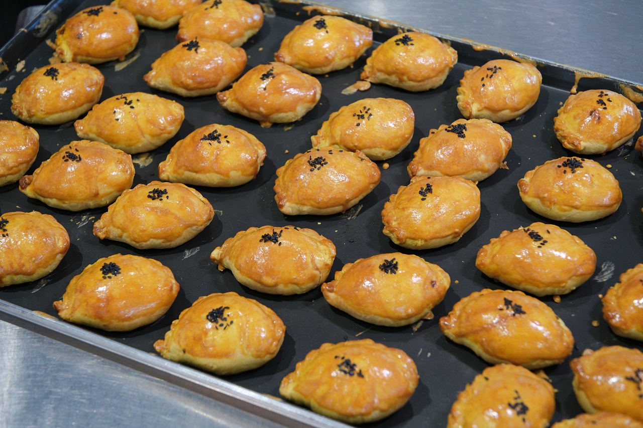 被網友稱為「被肉包耽誤的咖哩餃」是熟門熟路的老顧客都會買,每天門市現烤現賣,一盤30顆金黃色咖哩餃一出爐就被掃光,買不到的只好等下一爐。