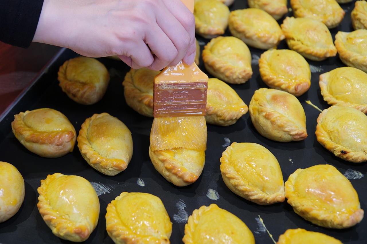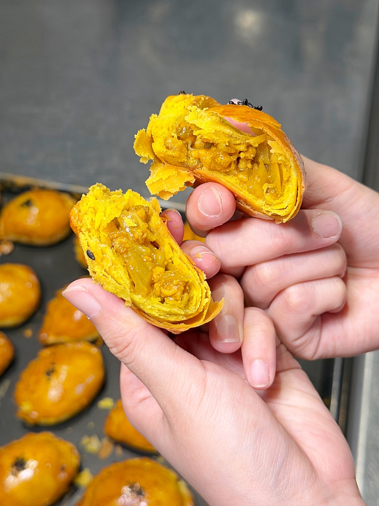 咖哩餃剛烤出來熱呼呼香氣奔放,咬下去層次香酥,內餡是絞肉洋蔥和濃郁咖哩醬香,我的媽呀!這個咖哩餃我必須先掃貨才行。到底是為什麼肉包店會有這麼厲害的咖哩餃呢?