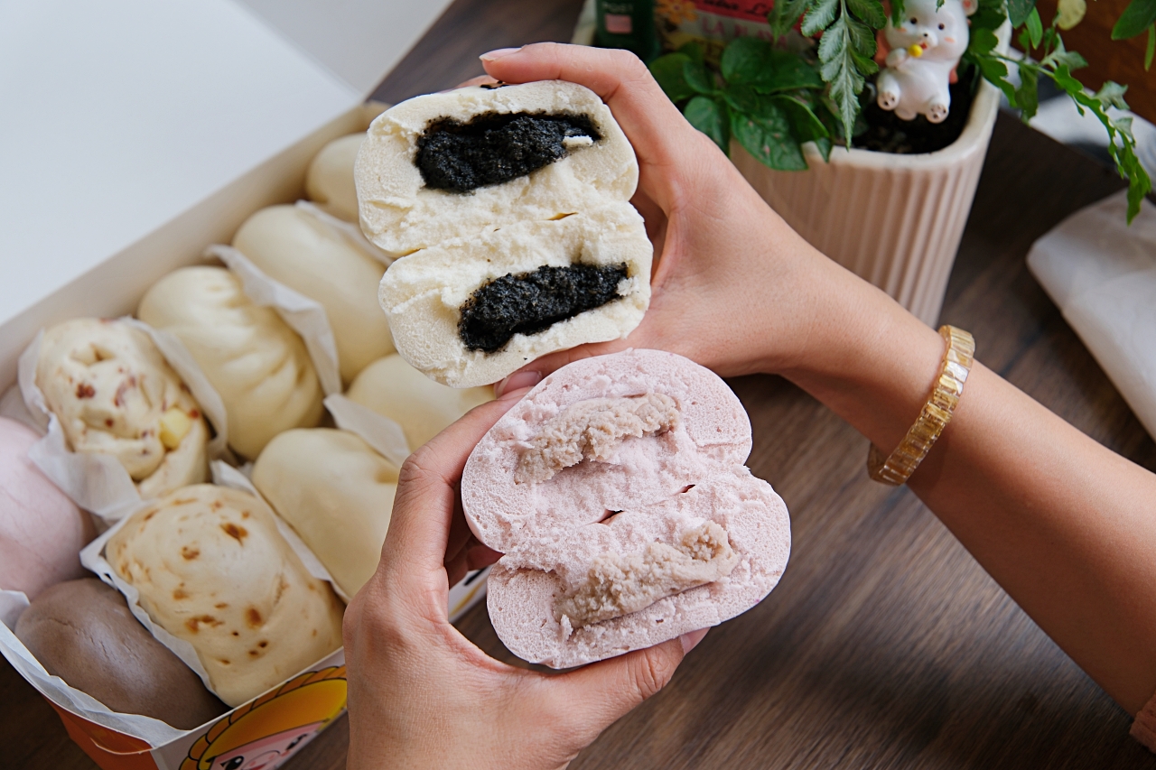 【紫薯芋泥包】內餡使用台灣最頂級的芋頭品種之一「大甲檳榔心芋」,口感綿密香甜,芋頭控會愛上!內餡的份量也很飽足,不同於一般市售芋頭包少少乾乾的內餡。【香濃芝麻包】黑芝麻內餡的包子,內餡處理得很好,沒有過多的油膩感,芝麻香氣濃郁、甜度不高,難怪店員很推薦。