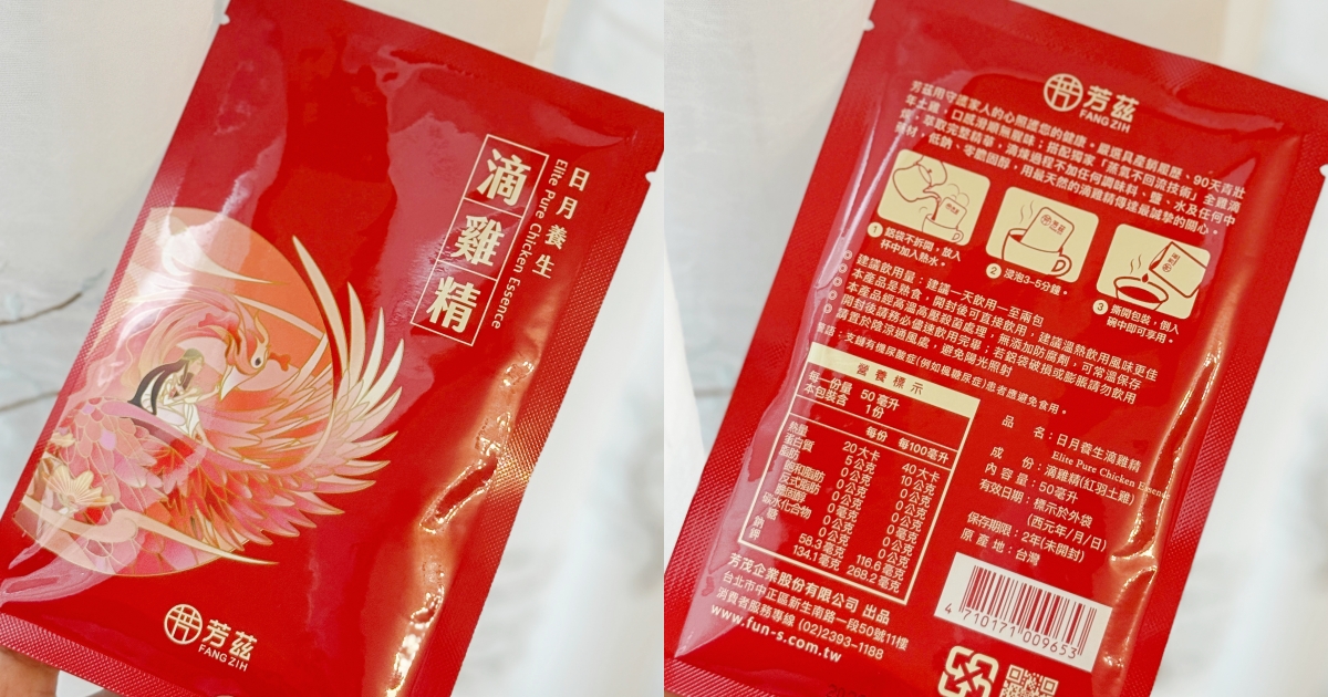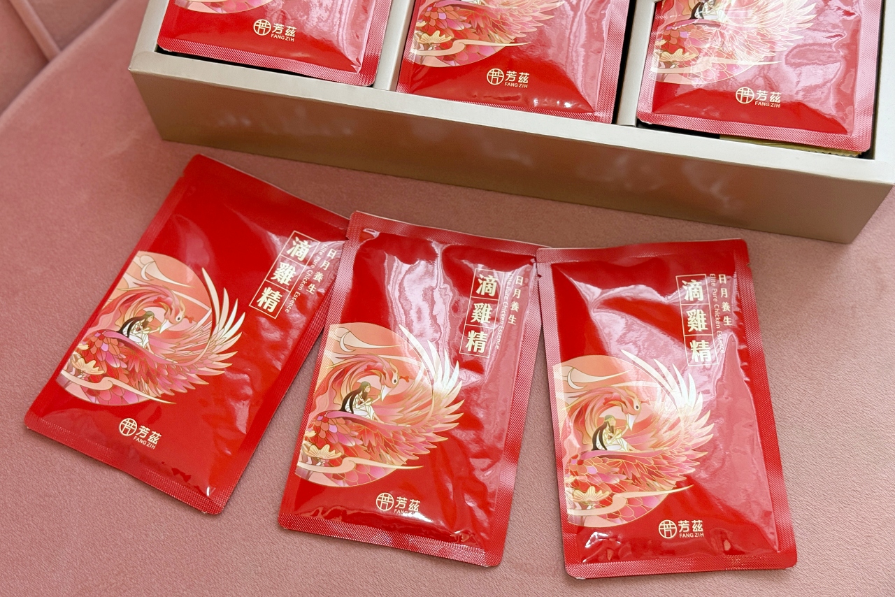 《芳茲滴雞精》採用全雞滴煉方式,不另外加水,喝到的每一滴就是雞隻本身的精華。一隻雞只能滴大約4包的量,很是珍貴。
