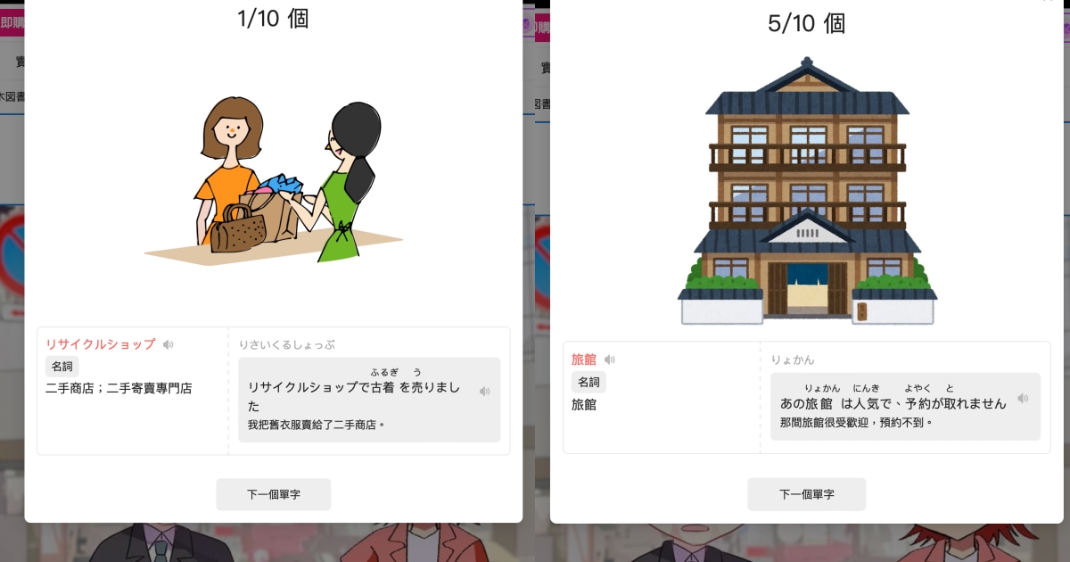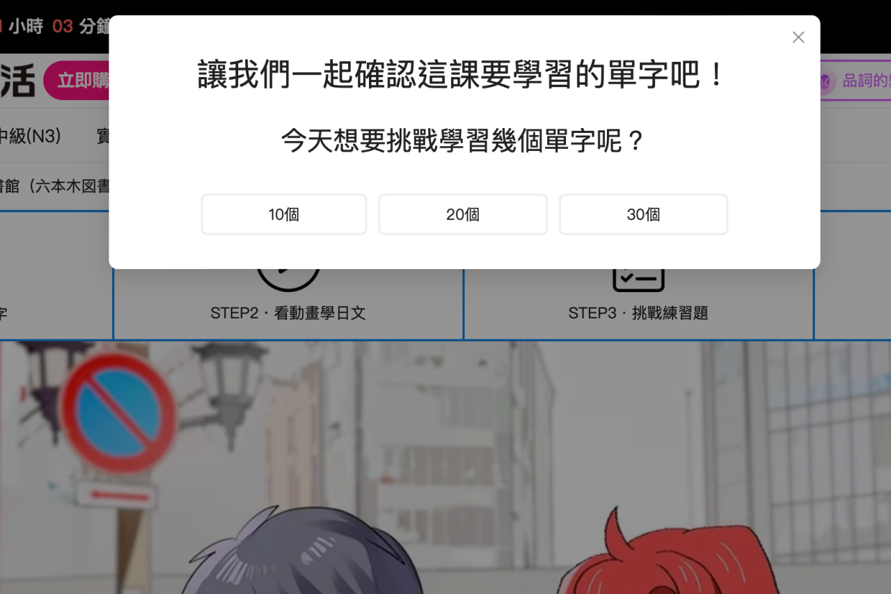要進入每一部動畫之前,會有「本課新單字」的區段,裡面是這個影片裡面會用到的單字,每單元會有10~30個新單字,可以自由選擇要挑戰多少個。每個單字都有真人發音跟例句,重點來了,是可以無限重播。我覺得這點超棒,可以無限次的反覆聽、練習發音、搭配例句,用最適合自己的節奏來學習,比起在日文教室上課,壓力要小很多。