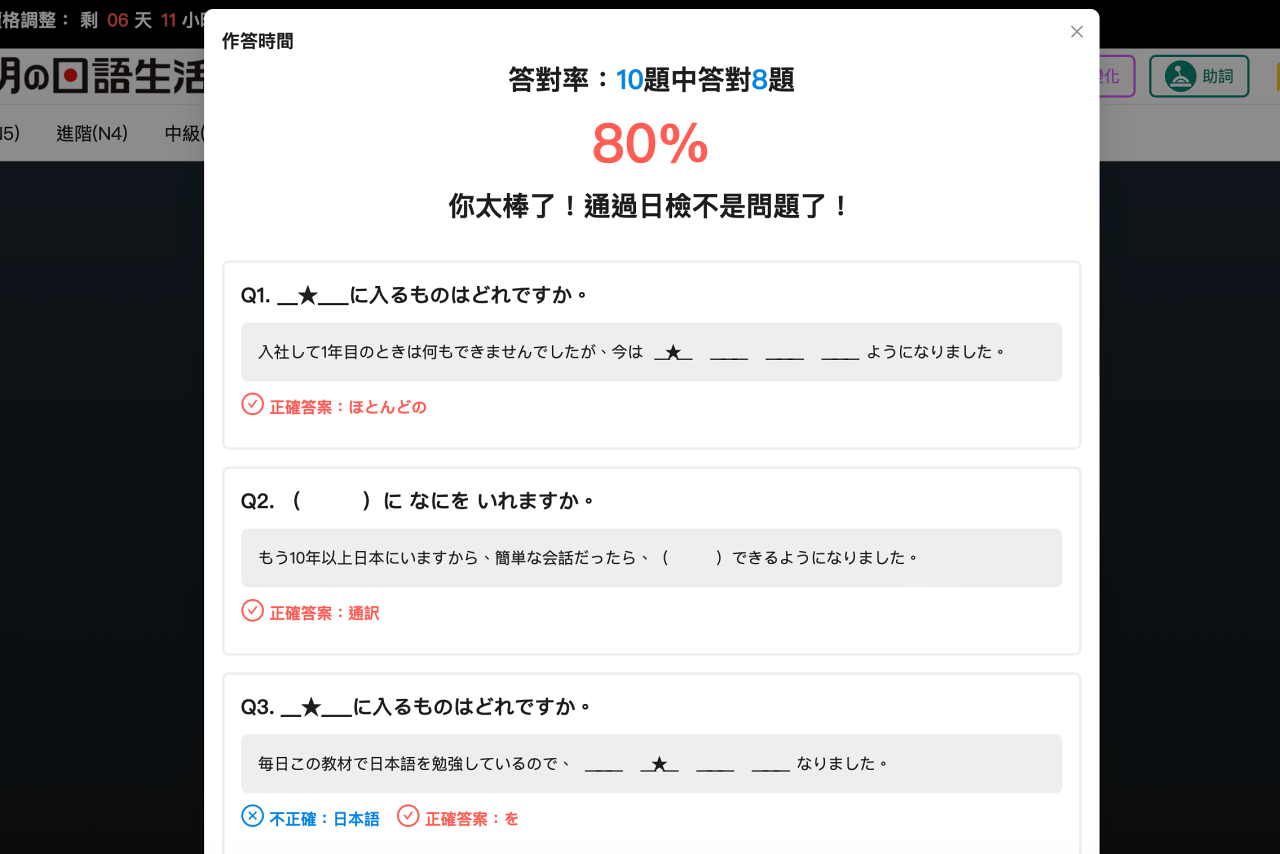 完成背單字、搞懂句型跟文法後,接著就是隨堂小考啦!直接實戰演練,可以趁記憶最深刻的時候快速檢視自己的學習成果,這個當然是可以無限次測驗,完全沒壓力。測試後馬上就能看到答案,哪裡答錯也一目了然。