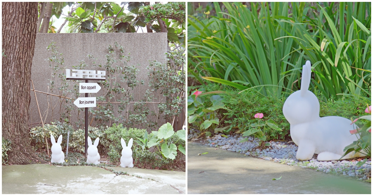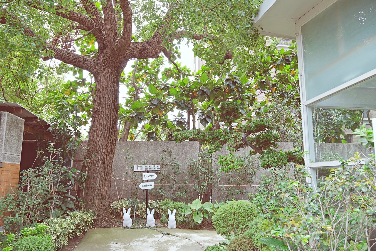 走進餐廳,兩層樓的老宅庭院被完整保留,巧妙銜接現代感的玻璃屋建築。陽光透過樹影灑落,這樣的畫面,說是一座會呼吸的建築也不為過。院裡高聳的百年樟樹和綠意盎然的小花園,是我夢寐以求的住宅啊。樹叢間有著小白兔的燈飾,增添了幾分趣味。