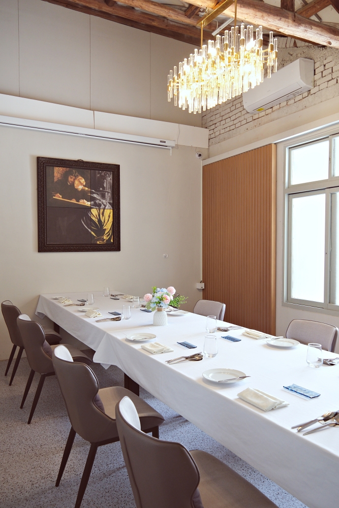 室內擺設簡約有致,細緻的器皿與桌面佈置是美感的延伸,餐廳內不定期展示藝術作品,與餐廳調性自然融合,讓整體用餐體驗不僅止於味覺,而是延伸至五感的全面沉浸。