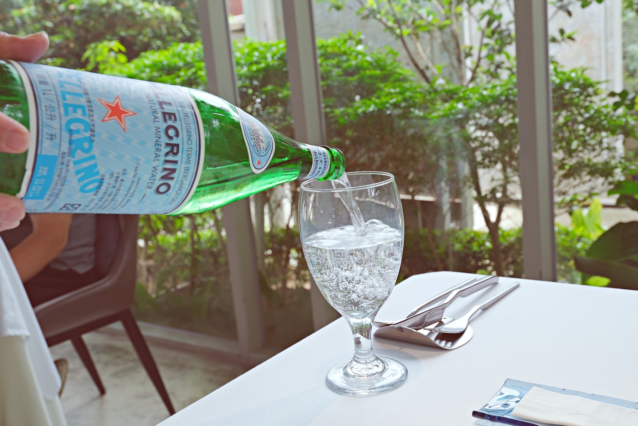 菜單巧妙的設計成邀請卡,讓來用餐的客人有賓至如歸的感覺,一入座服務人員便來詢問要一般礦泉水或是氣泡水(S.Pellegrino 聖沛黎洛),夏天用餐搭配氣泡水實在消暑。