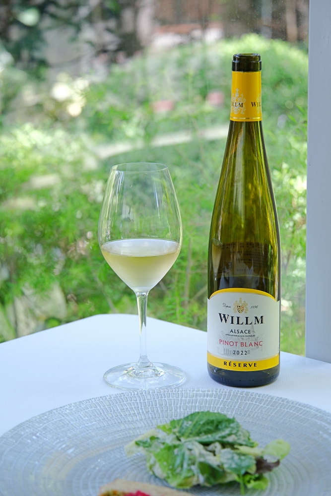 今天的餐點有多種海鮮料理,我們額外選擇了法國產的2022 Alsace Willm Pinot Blanc佐餐,這支呈現金黃色的白葡萄酒,果香濃郁、酸度清新、口感細緻,很討人喜歡。