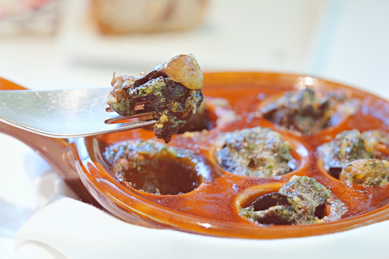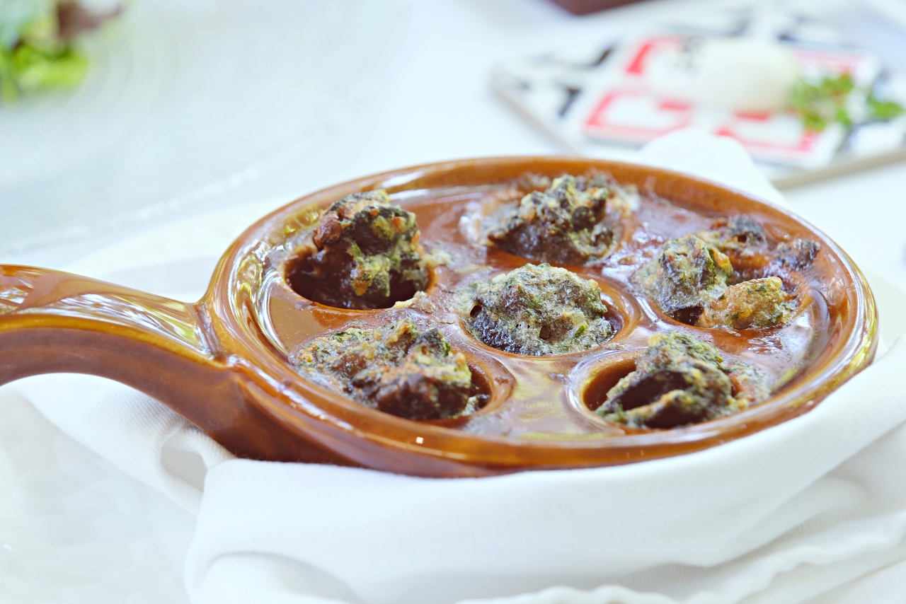 經典法式料理的代表「焗烤田螺」!專屬的蝸牛烤盤讓每隻蝸牛都有專屬位置。一口一顆滑嫩美味,鹹香的蒜味醬汁讓整體風味提升,配上白酒,實在完美!