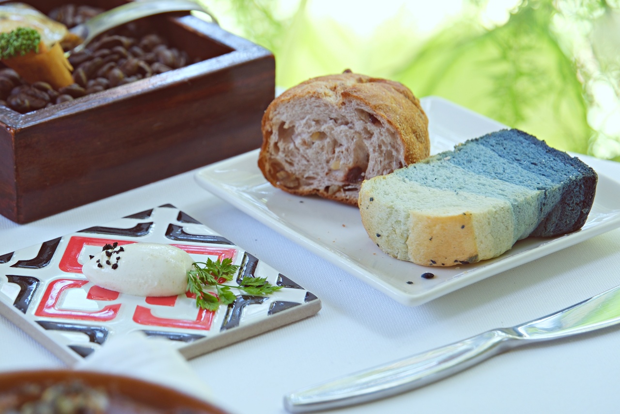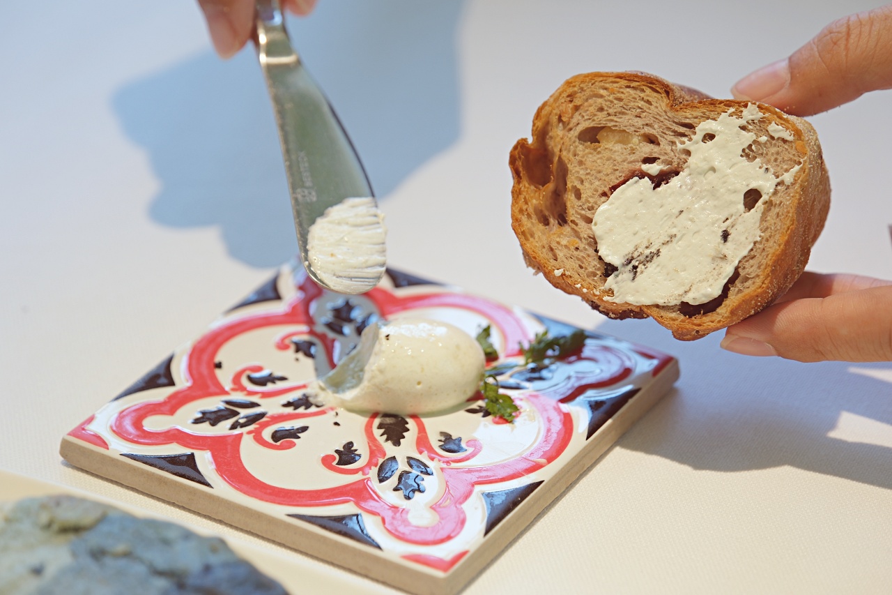 現烤出爐熱騰騰的麵包盤,是出乎意料的隱藏版驚喜!吸睛的藍染麵包,夢幻漸層藍是天然植物染出的顏色,軟綿口感讓人一秒愛上。桑葚核桃麵包外酥內軟,果香+堅果香雙重登場。抹醬是鯷魚奶油醬,鹹香鮮味有特色,麵包是可以續加的喔。