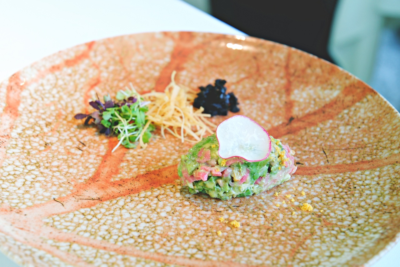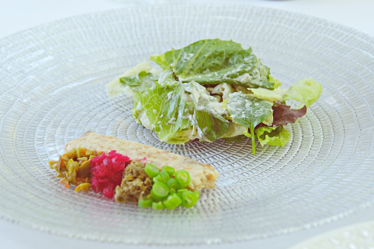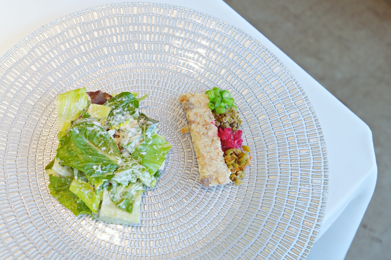 特製的煙燻鮪魚魚凍搭配經典凱薩醬生菜,每一口都鹹香中帶點煙燻尾韻,生菜的鮮脆和魚凍吃出層次風味。旁邊有酸豆、洋蔥、橄欖…等,想吃清爽、濃郁還是鹹香都能自由配。