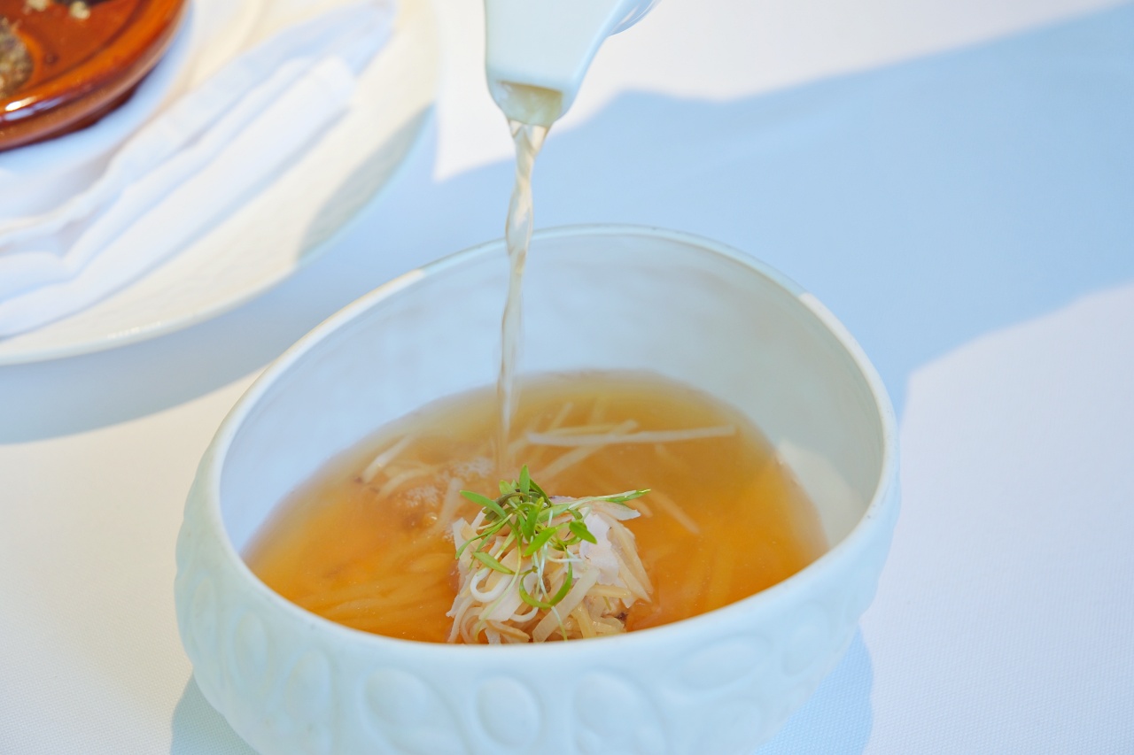 金黃清澈看似如水的雞湯,一入口有讓我驚艷到!雞湯的溫潤香氣撲鼻,那顆雞肉慕絲球,口感柔嫩得像在吃雲朵,雞肉的醇厚、鮑魚的鮮甜、筍子的清脆都完美合體。