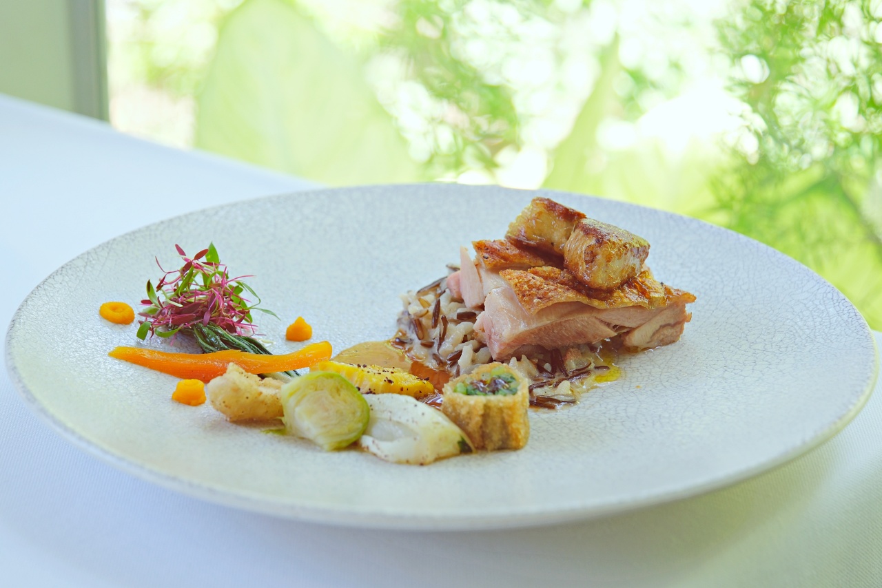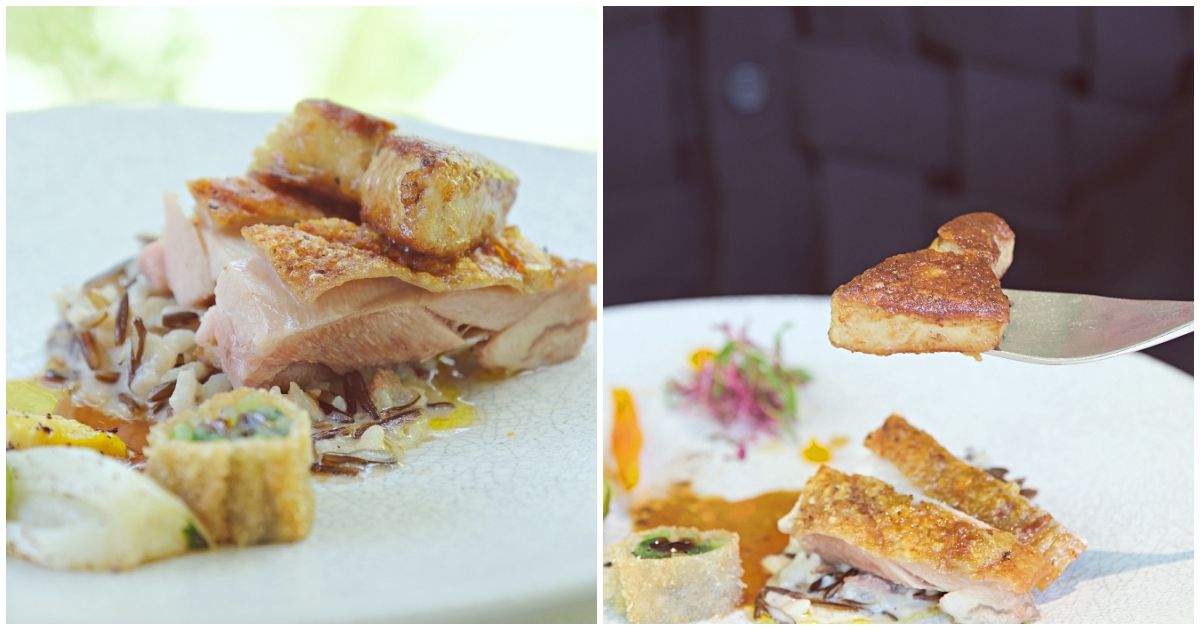 法國人叫它紅標雞,台灣稱作SASSO薩索雞,又有「紅標土雞」的名稱,是許多星級餐廳的指定食材。外皮金黃薄脆,咬下去口感結實多汁,很推薦再加點一份法式鴨肝,完全不後悔,表皮微酥,內裡像奶油般滑順,入口即化無腥味,這道餐點讓我印象深刻。