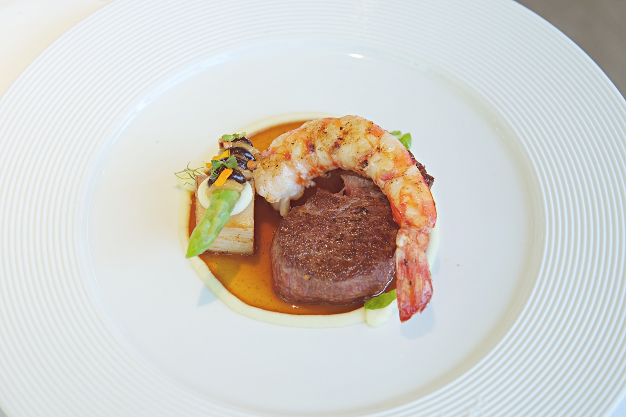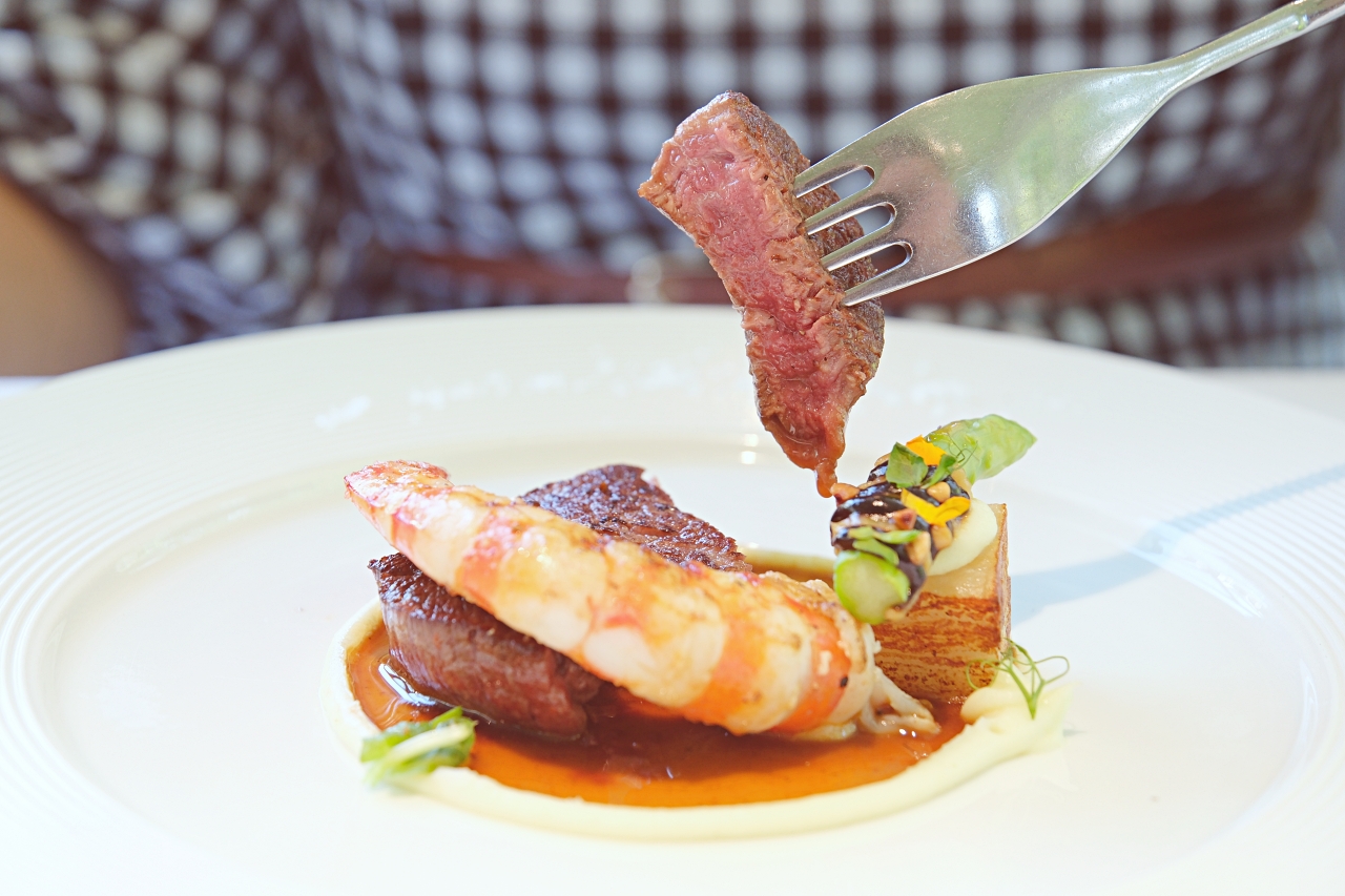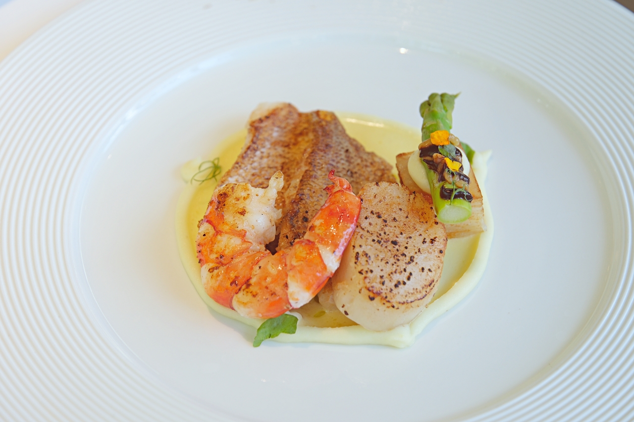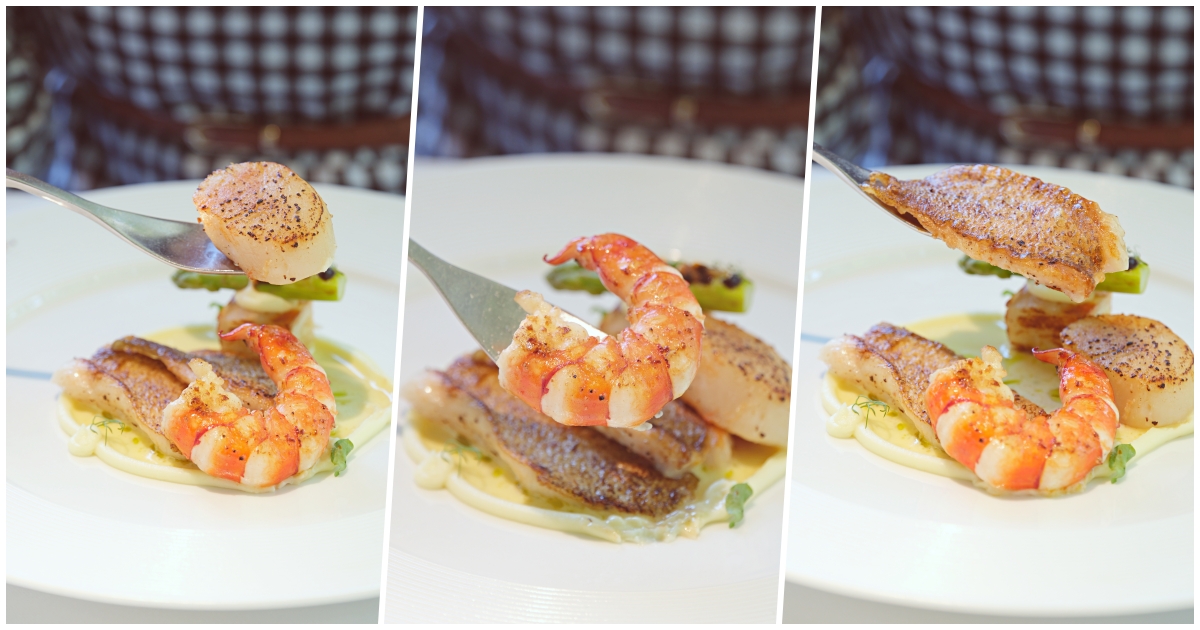 棲息在深海底層的紅喉魚被視為高檔食材,肉質鮮甜細緻很受歡迎。紅喉魚外皮煎到酥脆,裡面魚肉水嫩嫩,配上菌菇鹽便很迷人。干貝煎到表面金黃微脆,裡頭還保留生食的嫩度,一咬下去鮮甜度噴發。加點了肉質扎實的海大蝦,讓整體豐富度加分!旁邊搭配的千層馬鈴薯脆口好吃。