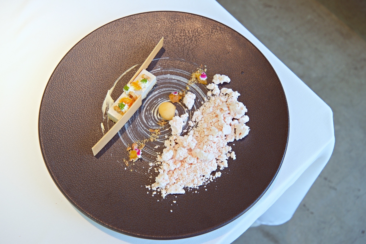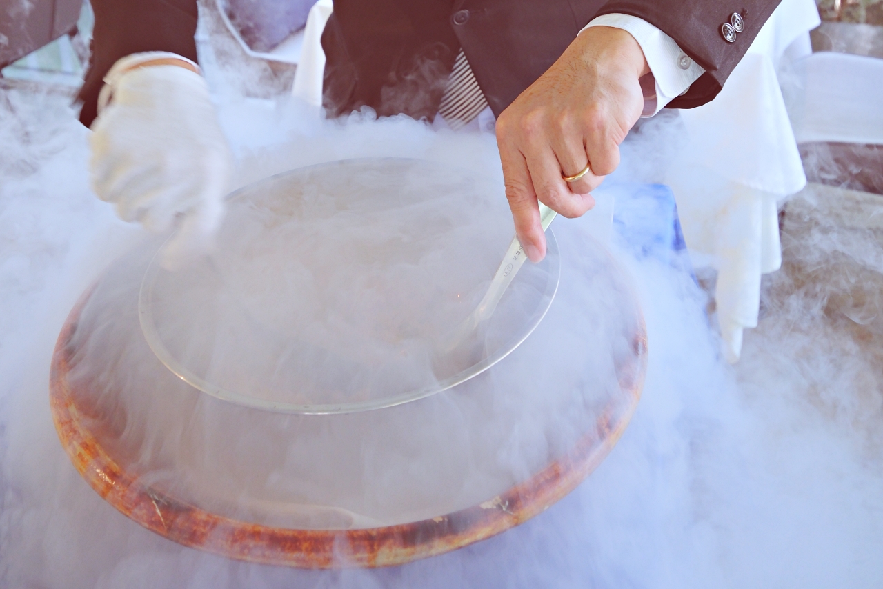 壓軸登場的是會噴煙的炒冰秀,怎麼連甜點都浮誇的不放過我眼睛啦!炒冰吃起來有酸甜果香,還融合奶香的滑順口感,吃起來冰涼又不膩。一旁的伯爵慕斯蛋糕,輕柔綿密、茶香淡雅。兩道甜點一活潑一優雅,完全收服甜點控的心。