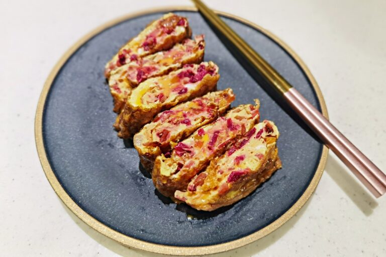 ▲把完成的蛋捲盛盤就成了一道很吸睛的火龍果料理,這個煎蛋捲顏色好夢幻啊!