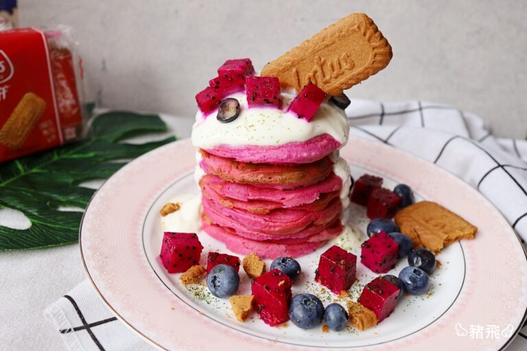 ▲把美麗的粉紅色鬆餅堆疊起來,淋上原味優格、蜂蜜,用火龍果丁、藍莓、脆餅….做裝飾,就完成這道網美級甜點囉!