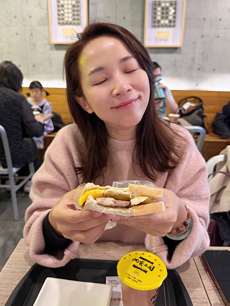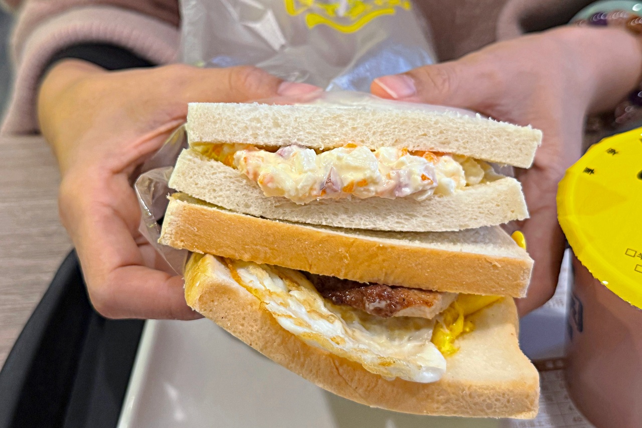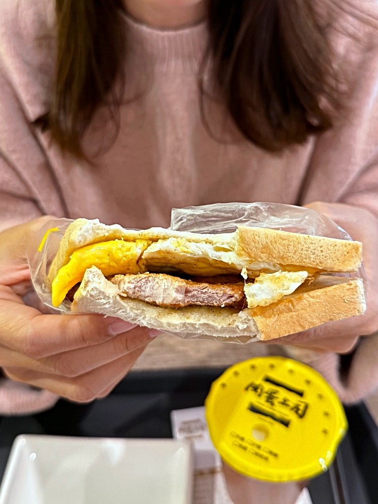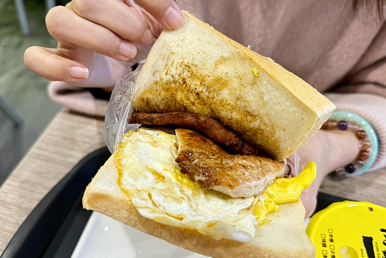 一打開包裝,奶香直接撲鼻而來,白吐司鬆軟是最大特色。裡頭夾著厚實醃過的豬排和煎蛋,再抹上店家自製美乃滋,看似簡單平凡的組合,吃過就難忘。咬下去甜鹹交錯、肉排扎實,每一口都讓人心情很好,這就是傳說中的招牌肉蛋吐司,吃一次就會懂為什麼大家都甘願早起排隊啊!