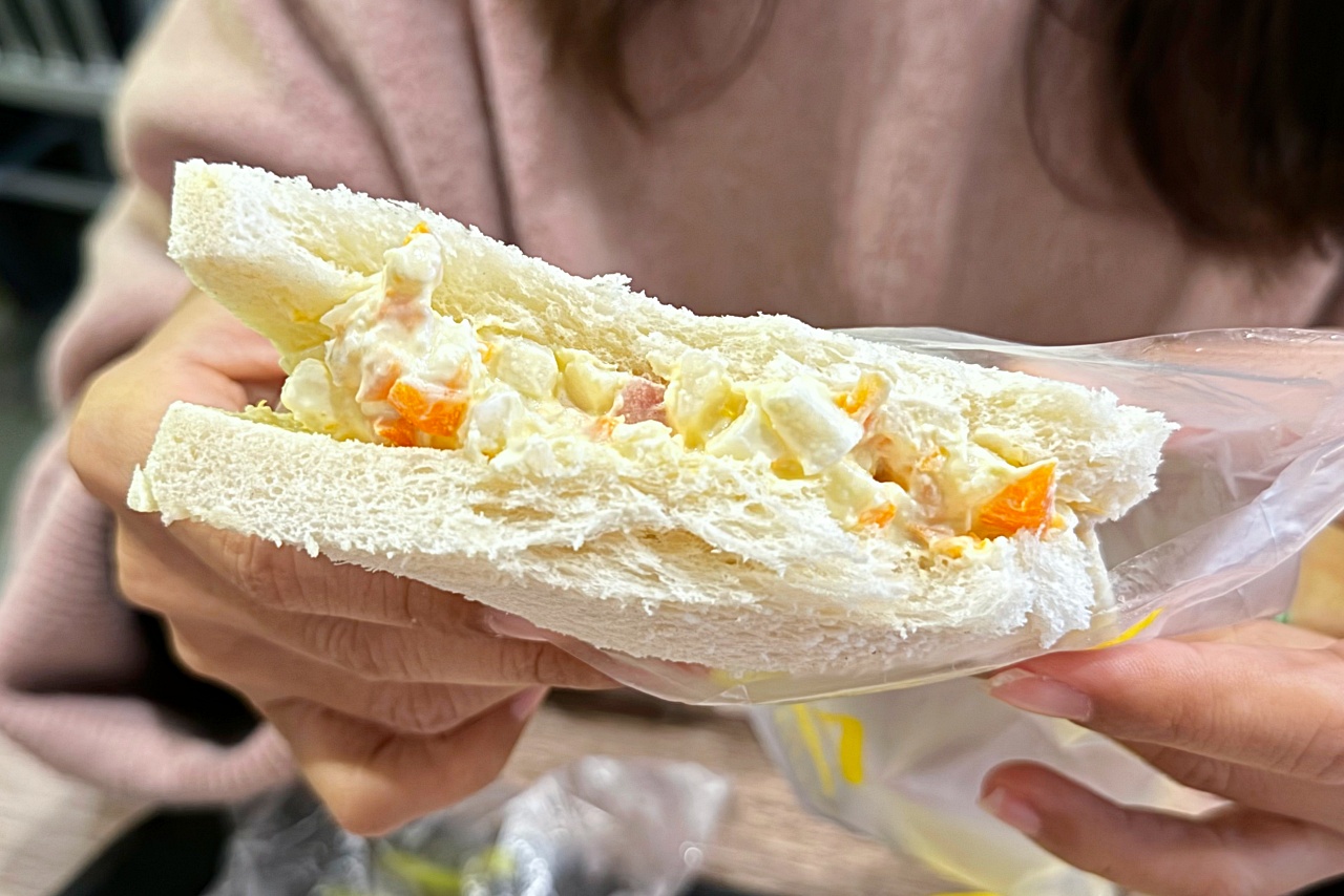 女生會很愛的清爽口味沙拉吐司!吐司已經貼心去邊、鬆軟不乾,中間塞爆蛋香馬鈴薯沙拉和火腿丁,咬下去滿嘴綿密滑順,雖然餡料混搭美乃滋,卻一點也不膩。我覺得它實在太邪惡了,心裡想著熱量高,結果還是一邊喊邪惡一邊快速吃光,真的是停不下來那種。吃完有夠飽足。