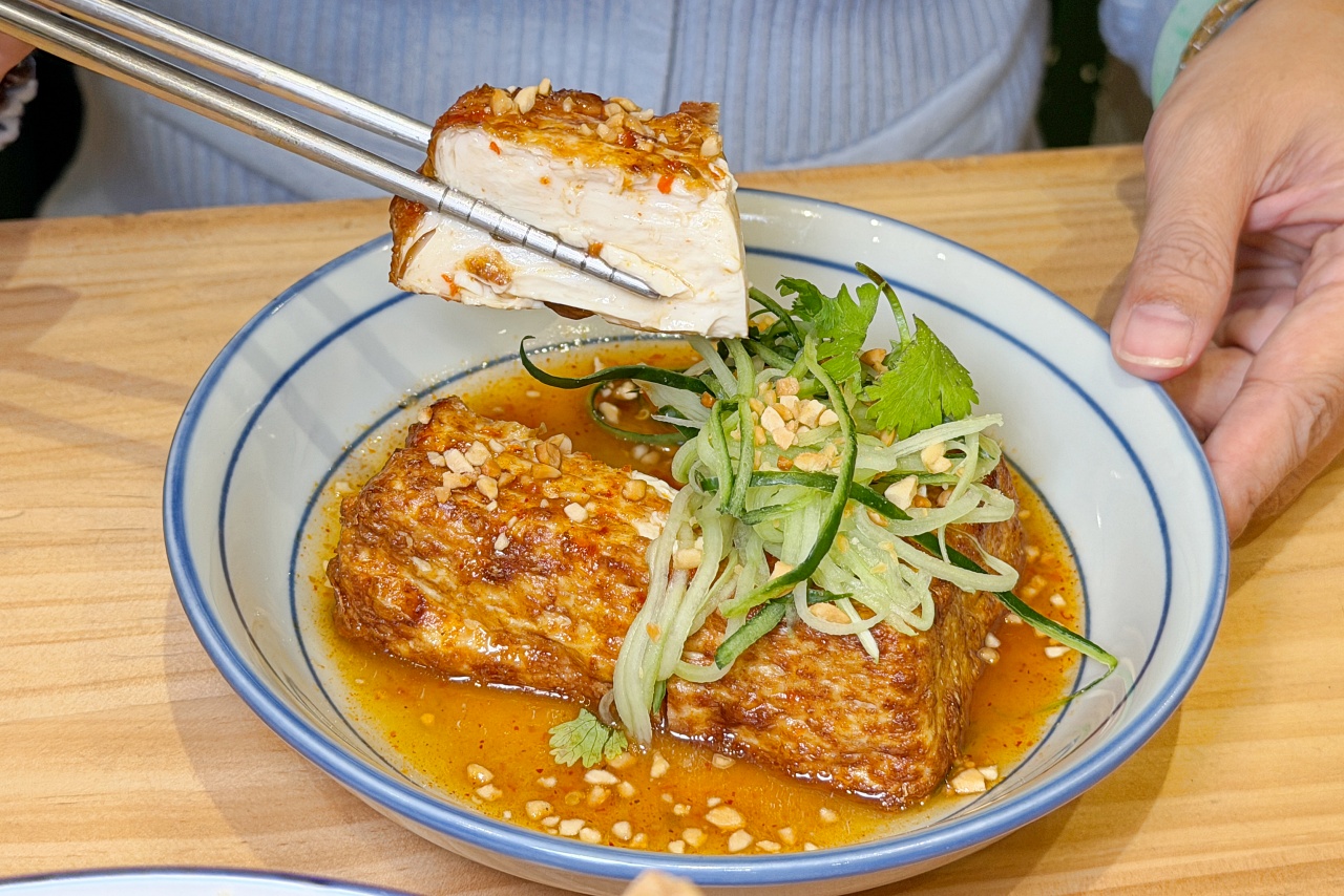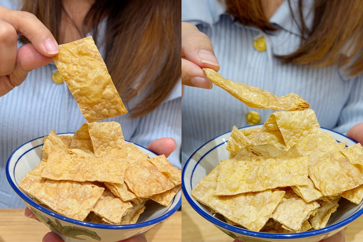 「酥脆豆皮」是薄片豆皮先調味後再酥炸,吃起來很酥脆,帶著淡淡甜味,每一口都很涮嘴,這根本可以當追劇零嘴了。這個強烈推薦必點!