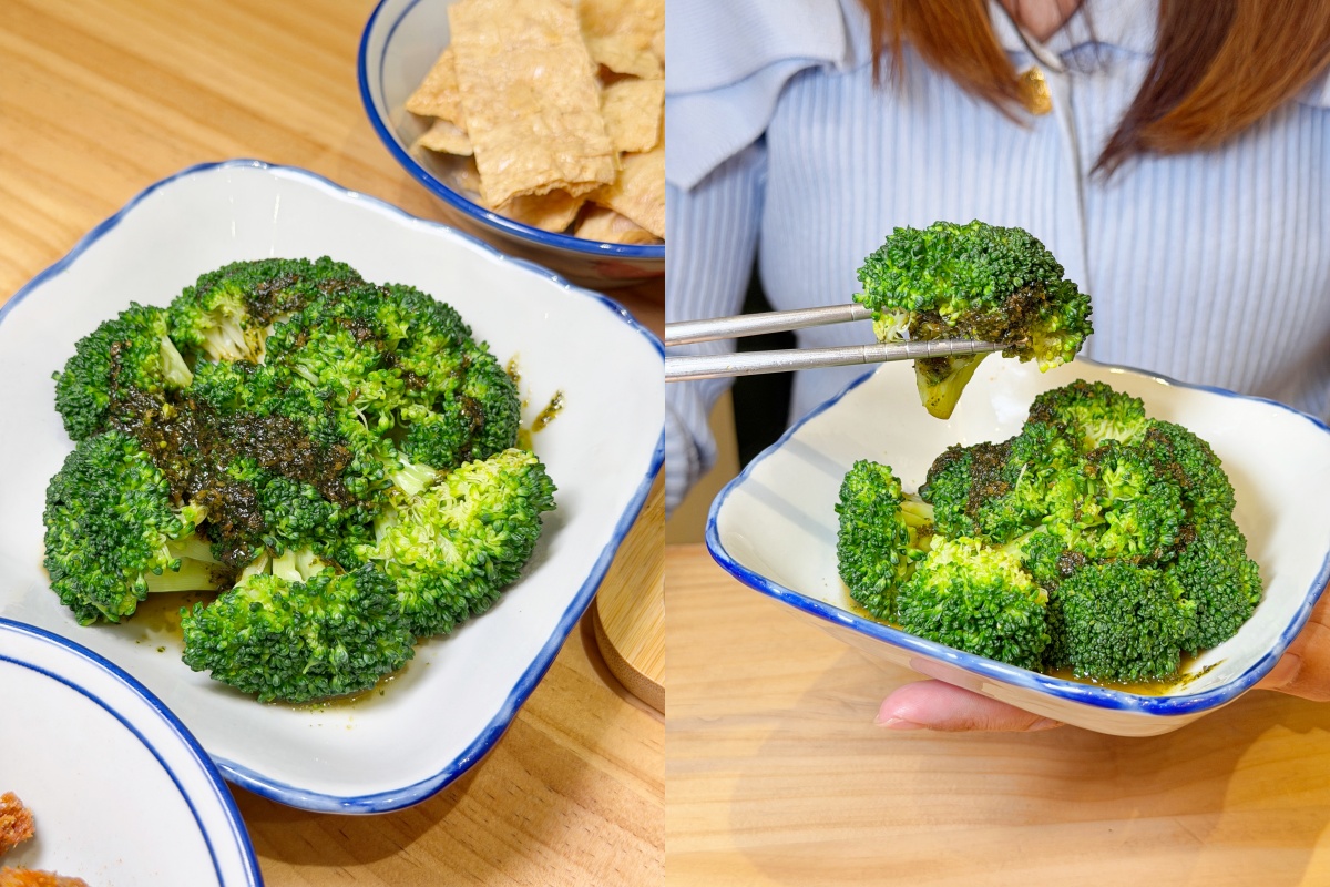 「香椿花椰菜」川燙過的綠花椰菜淋上香椿醬,香氣濃郁卻不會搶味,是一道很適合搭配主食的蔬菜料理。