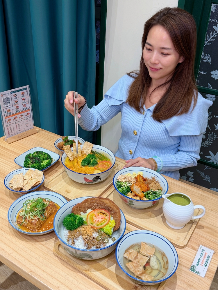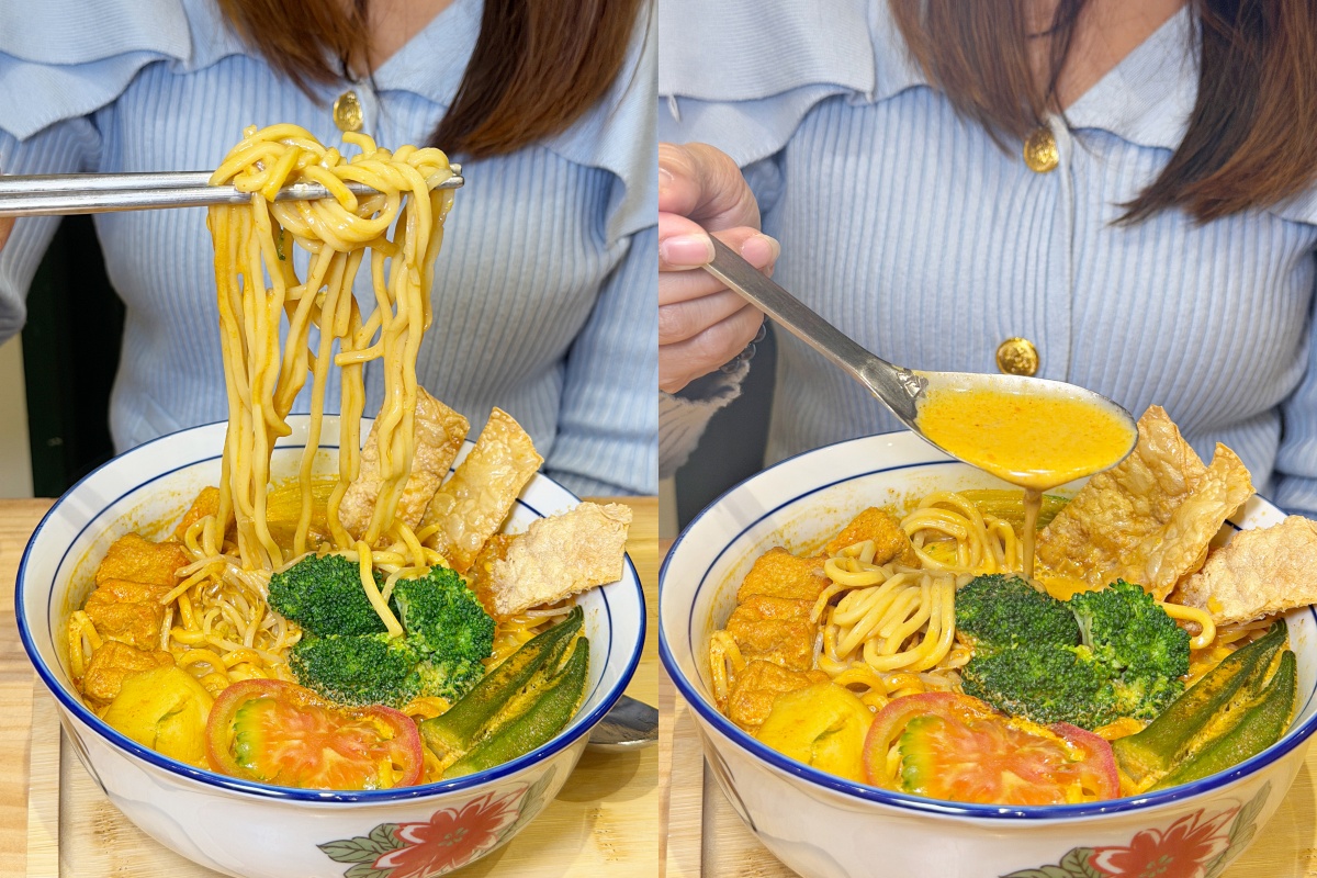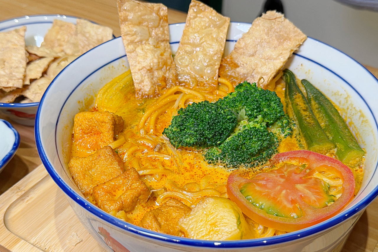 「新加坡咖哩麵」走的是叻沙風味,湯頭帶點微辣跟椰漿香氣。裡面有娃娃菜、青花菜、秋葵、油泡與馬鈴薯,搭配酥脆豆皮與豆芽增加口感。再加上牛番茄片的微酸,整體味道平衡,算是菜單裡香氣濃最郁的麵食。
