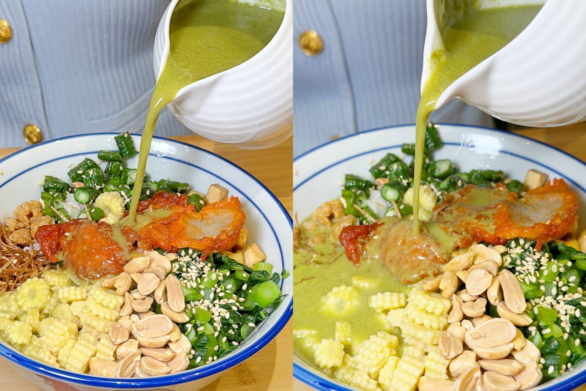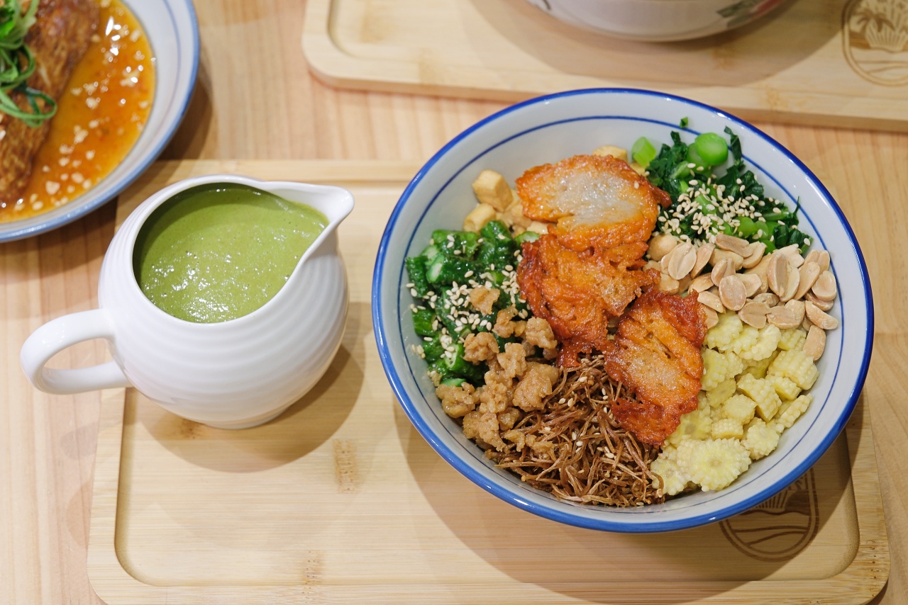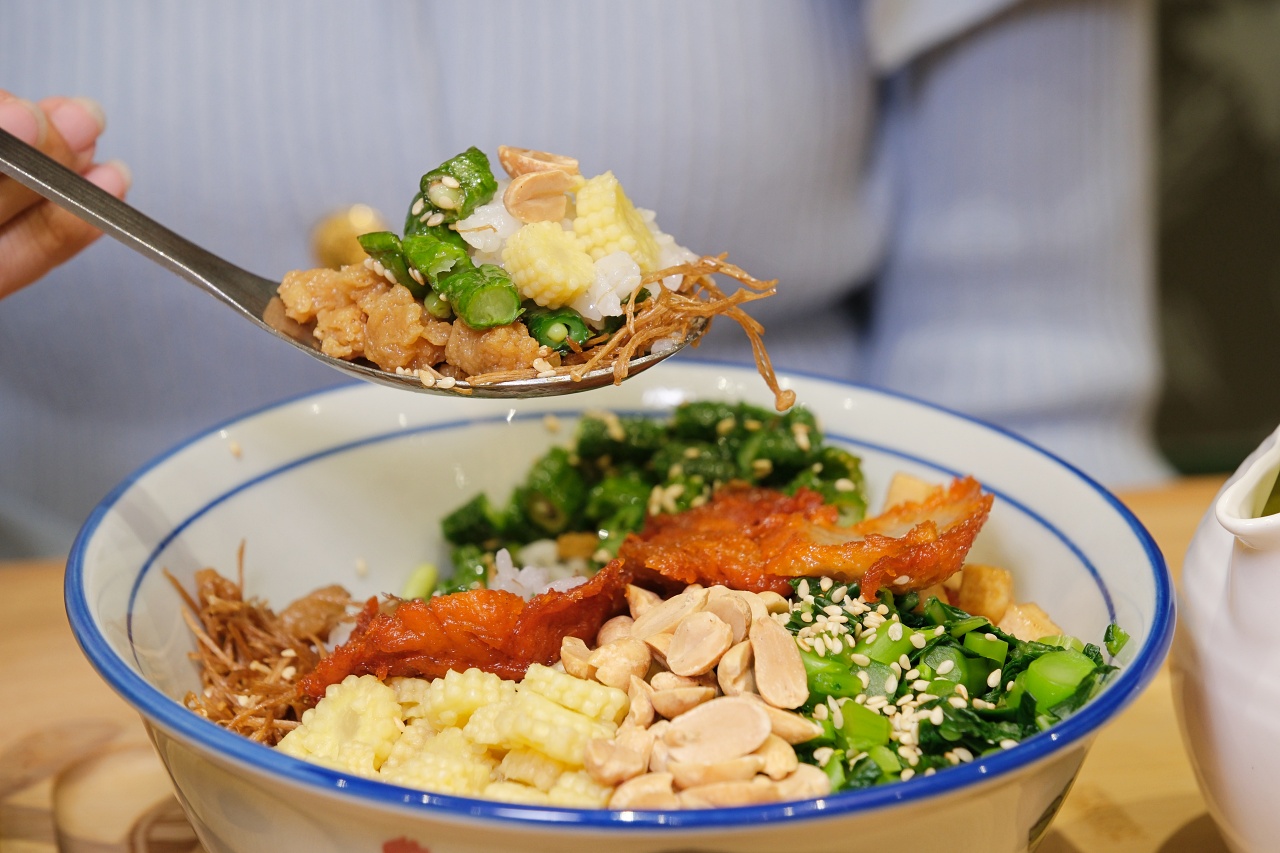 「馬來鹹擂茶飯」這道料理視覺上很有甜點的fu,五香豆乾丁、長豆丁、金針菇、芥蘭菜與玉米筍丁整齊鋪在飯上,再搭配三片叉燒素肉,料也太多了吧!特別的是加入炸的菜碎圃與油炸金針菇,口感帶點酥脆,像炸豬油般的香氣讓整體更有層次,再撒上白芝麻與花生粒。