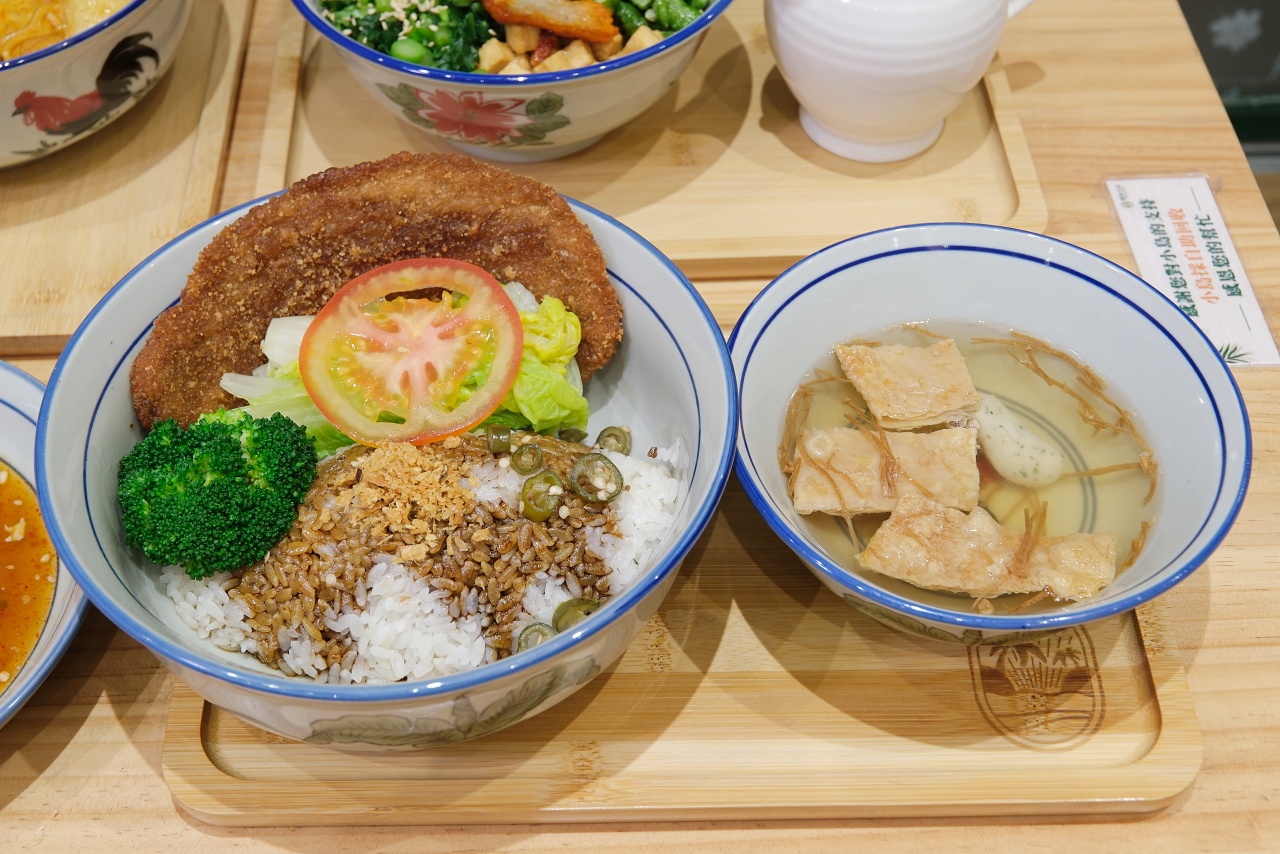 「銷魂排燒飯」名字聽起來就很威,整碗的主角是外酥內紮實的素排,看外表會讓人誤以為是肉類呢。搭配青花菜、帶有香茅香氣的娃娃菜,以及酸甜脆口的青辣椒,白飯撒上香鬆,最後淋上店家特製黑醬與麻油。整碗飯香氣十足,還附上一碗素湯,吃起來很有飽足感。