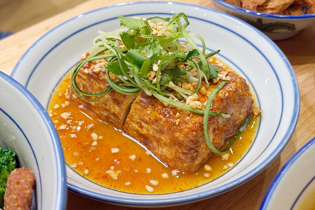 「泰式酥豆腐」用整塊中華豆腐油炸到外皮金黃,口感有點像濕豆皮的酥感,裡面是軟嫩的。鋪上小黃瓜絲,再淋上泰式酸甜醬,最後撒上花生粒,清爽開胃。