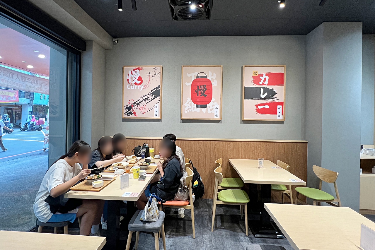 「慢咖哩」以經典日系紅白配色打造門面,遠遠看就超顯眼,整體設計明亮又帶點元氣感。店面寬敞明亮,大約擺放10張四人桌,很少看到咖哩店設置這樣多的座位數。座位之間間距剛剛好,不擁擠、超舒適,不管是揪朋友聚餐、同事吃飯還是帶爸媽出門都超適合。用餐時間一到學生族群、上班族、家庭客全都出現,人氣爆棚不是沒有理由!