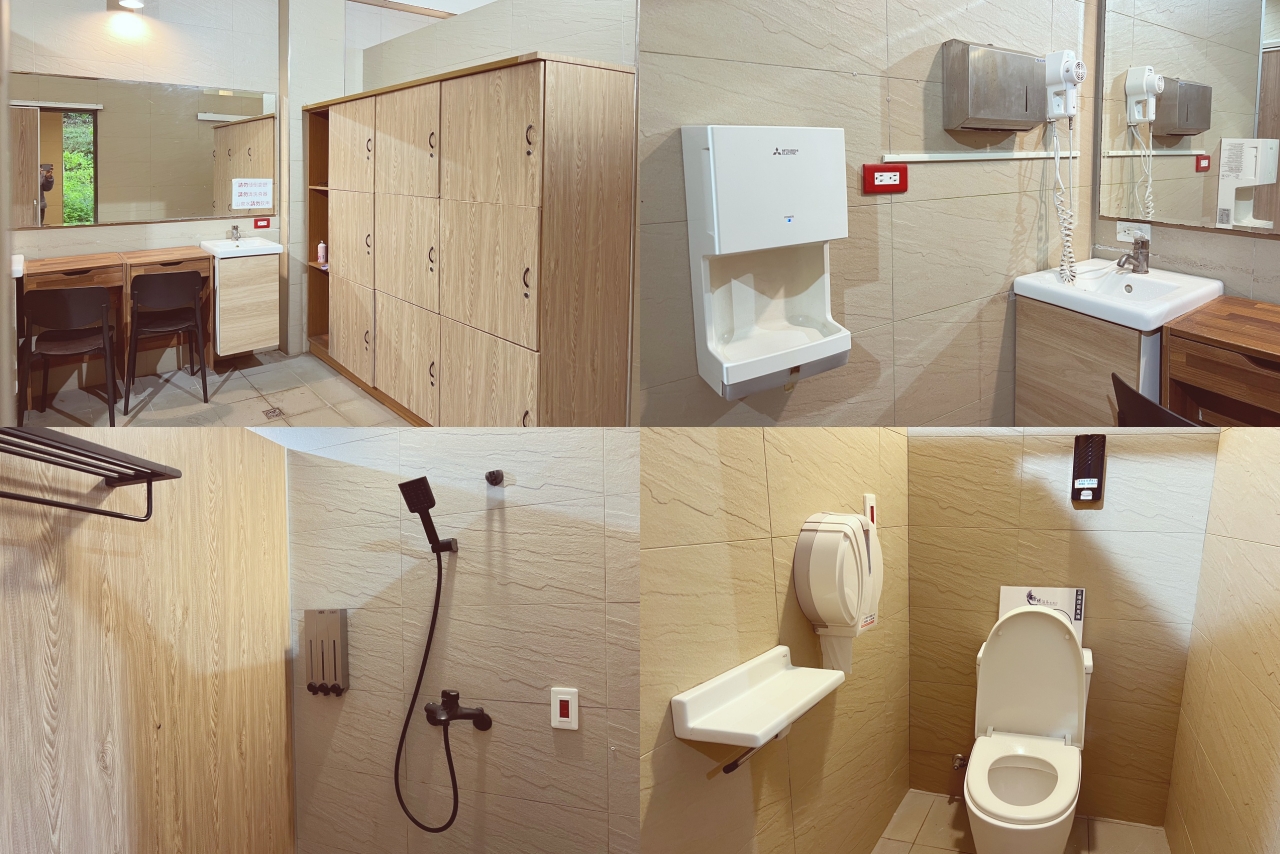 ▲ 紅磚建築是公用衛浴,包含有淋浴間、廁所、化妝台、置物櫃,設施完整乾淨。