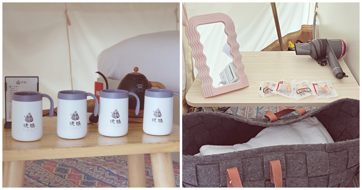 ▲基本的配備都有,像是活動小桌、煮水壺、水杯、吹風機、鏡子、毛巾,怕吵的朋友也不擔心,桌上放有耳塞。