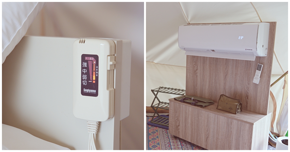 ▲來入住的這天風大雨大,晚上將近10度的天氣,床上備有電毯我是整晚都開著直接舒服入睡。也備有一台冷暖氣機,一進帳篷就先打開。