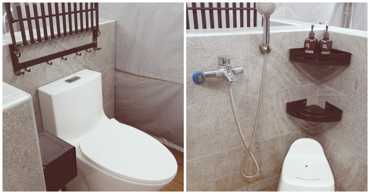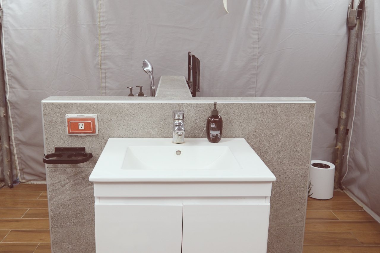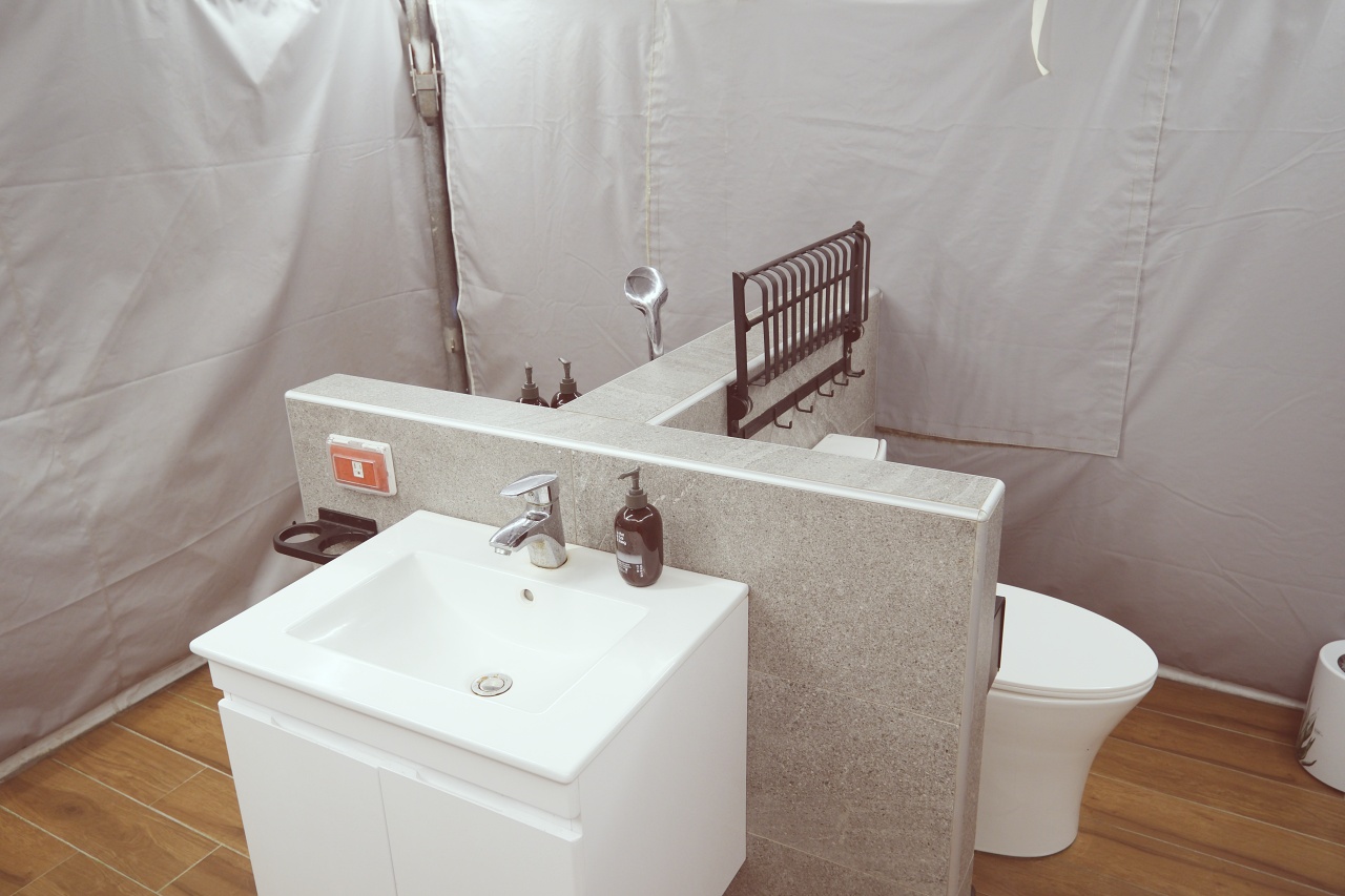 「俯雲區」最受歡迎的點就是有自己帳篷內的獨立衛浴,很多人不愛露營的原因大多數是因為是使用公用衛浴,想露營又想要有自己獨立衛浴的話不妨考慮這裡,淋浴、洗手台、馬桶雖然不是豪華設施,但基本使用都很OK的,空間保持的乾淨沒有不舒服的味道,豬飛很愛蟬說系列的豪華露營也是這原因。