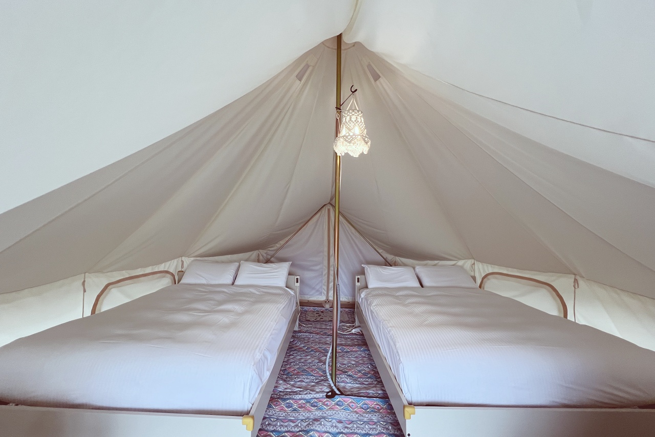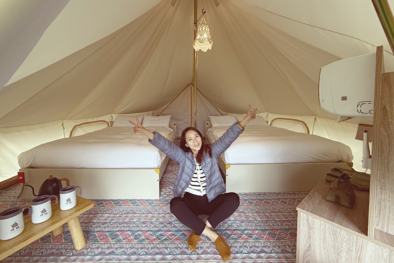 這次入住的是「俯雲區」的102號帳篷,是由兩個帳篷前後搭建起來,包含臥室與浴室兩個區域。神殿帳的空間很大,每個帳前都有自己的一區桌椅,帳篷內是兩張雙人床,最多入住四人,一家人來度假很剛好。如果是一個家族過來也便利性十足,帳篷相鄰要串門子也方便。