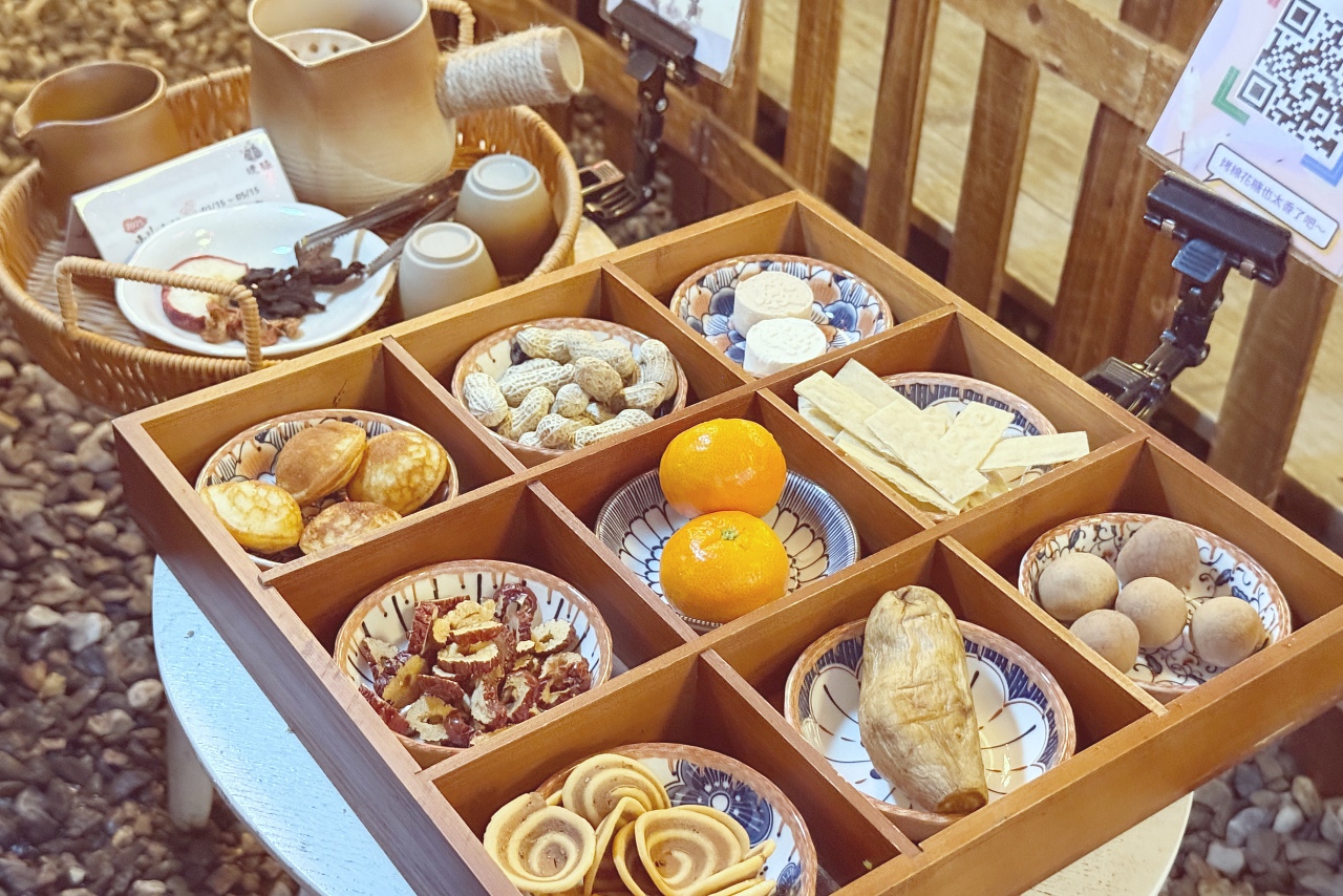 台灣興起圍爐煮茶的風潮,一直很想感受這樣的愜意氛圍,沒想到誤打誤撞在「蟬說:暖硫」實現啦!用九宮格的茶點配上陳皮山楂蘋果紅茶,剛好來的日子下著大雨,我們圍著烤爐很是享受。